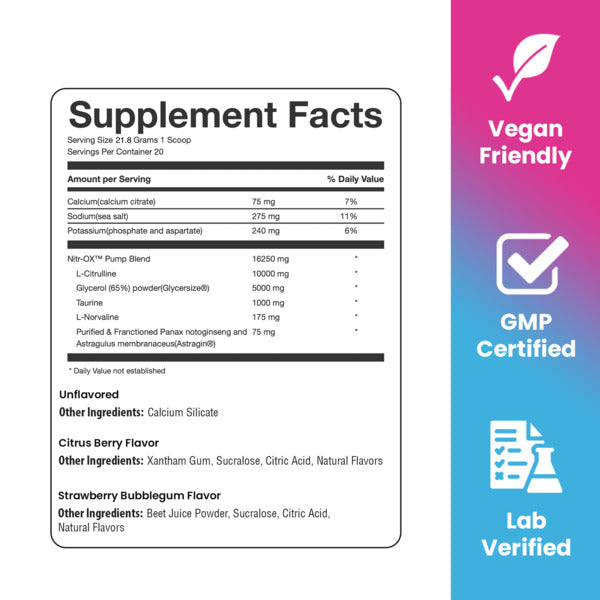Then we get to that exciting ‘pump’ component. Two of the most effective compounds ever formulated for pre-workouts. Glycerol and L-norvaline are combined to ensure nitric oxide is on full throttle overdrive during your workout, and the blood keeps pumping to the working muscle as though an emergency donor is delivering a transfusion. It’s that insane. That skin-tearing feeling means something. It means growth, and for that reason alone does it warrant your attention. Keep Nitr-OX by your side, and watch hypertrophy shoot through the roof.